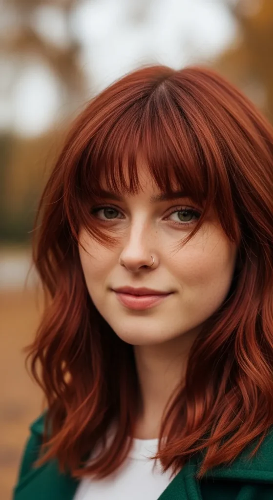 The copper tones reflect light beautifully, making the hairstyle appear fuller. It’s ideal for anyone wanting a color change without going blonde. The soft fringe also suits smaller foreheads and balances facial proportions.
