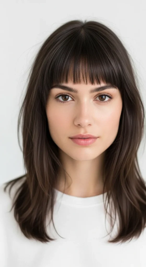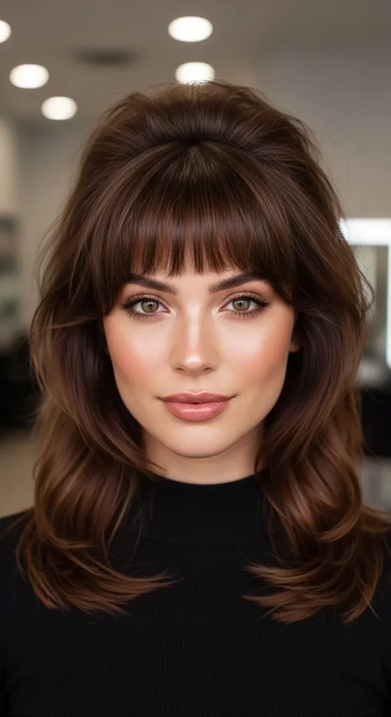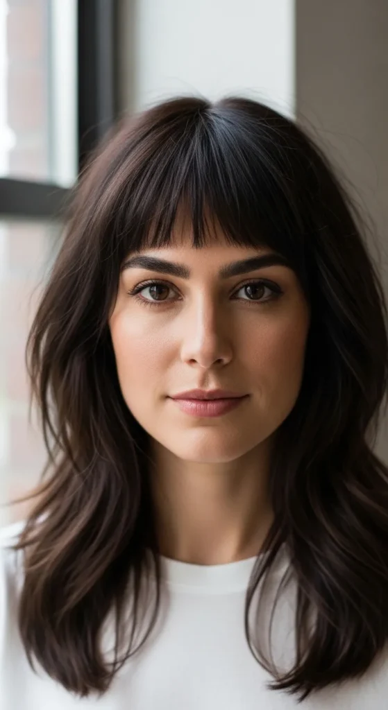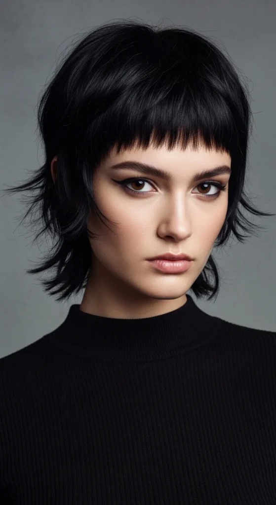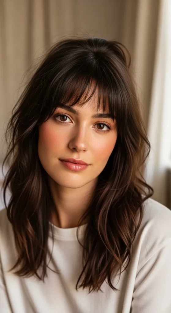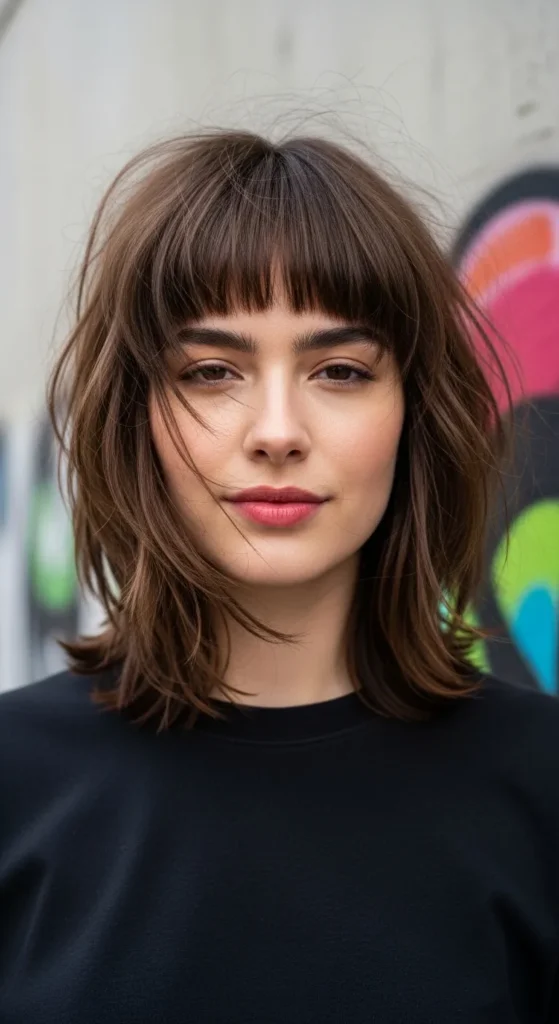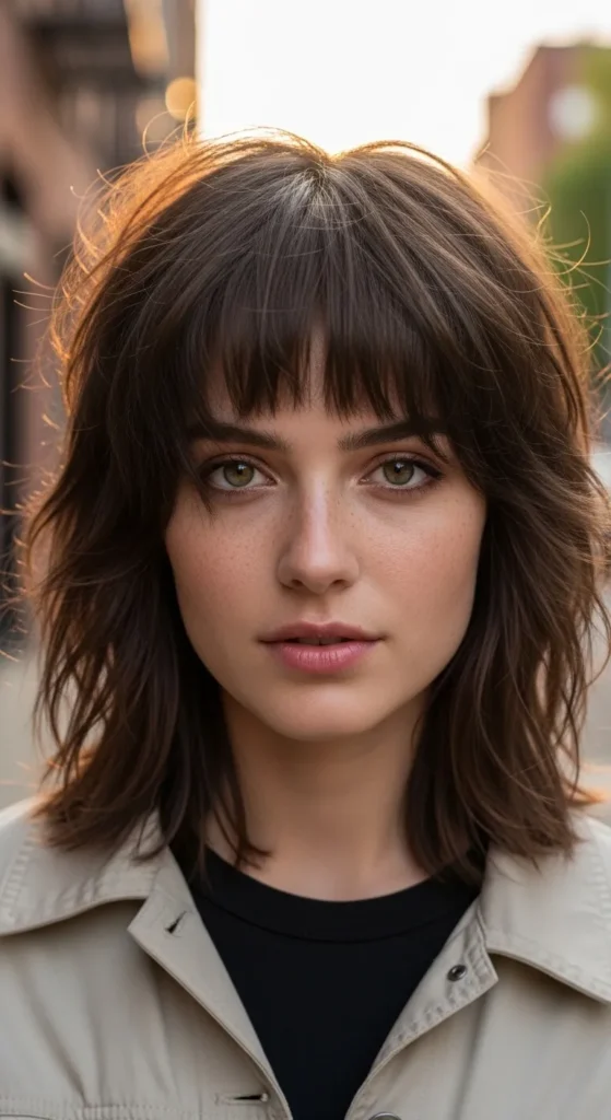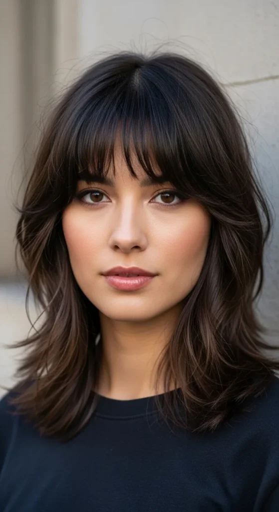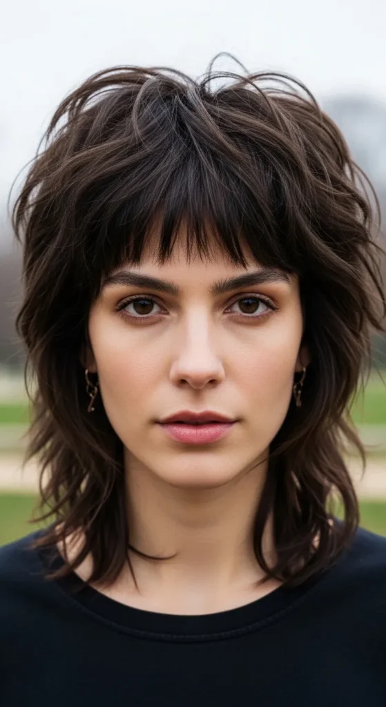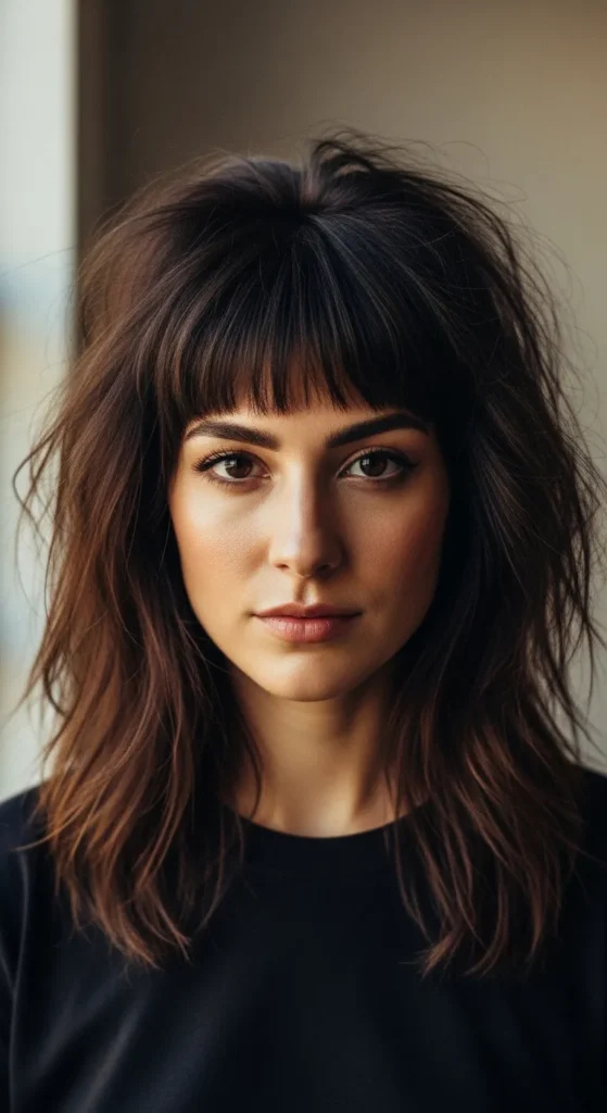Dark shades make the shaggy wolf cut with bangs look richer and more defined. Brow-grazing bangs draw attention directly to the eyes while keeping the haircut soft. The deep tone enhances shine and dimension.