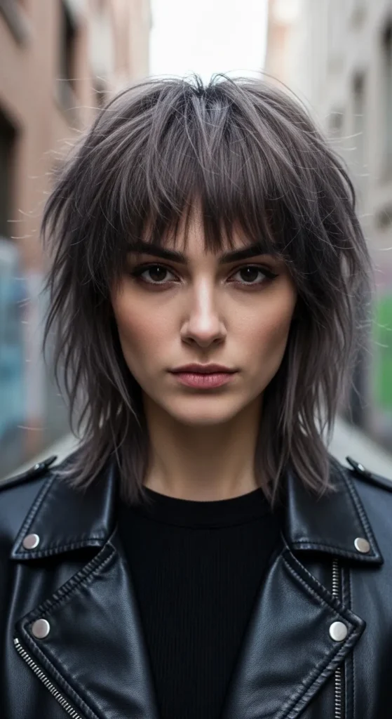 This edgy version of the shaggy wolf cut with bangs is bold and full of personality. Razor layers create sharp movement and dramatic separation, giving the haircut a rebellious touch. The uneven bangs enhance the textured vibe.