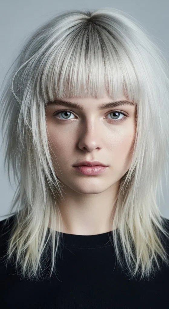 This platinum version of the shaggy wolf cut with bangs is bold and high-fashion. The blunt bangs create strong contrast against the soft layered ends. Combined with icy blonde color, the look feels modern and powerful.