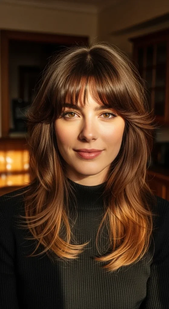 Face-framing layers make the shaggy wolf cut with bangs extremely flattering. The shorter front pieces contour the cheeks and jawline naturally, almost like built-in styling. This is one of the most requested salon variations right now.