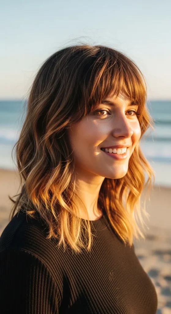 Beach waves add movement and softness to the shaggy wolf cut with bangs. The layers enhance the wave pattern, creating a relaxed vacation-like appearance. This is one of the most saved Pinterest looks because it feels effortless.