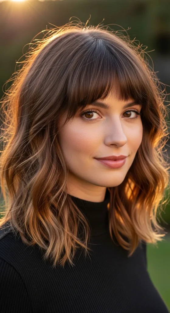 The shoulder-length shaggy wolf cut with bangs is one of the most practical trends this year. It’s long enough to tie back but short enough to feel light and fresh. Choppy bangs add personality and prevent the haircut from looking too soft.