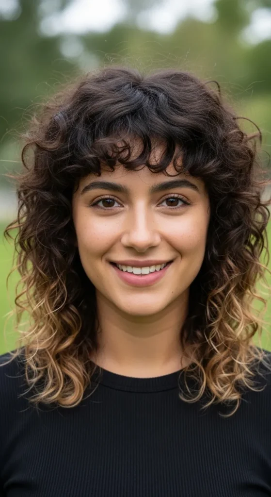 The shaggy wolf cut with bangs looks absolutely stunning on natural curls. The layered structure enhances curl definition while reducing heaviness at the bottom. Curly bangs add a playful and youthful touch that feels fresh and modern.