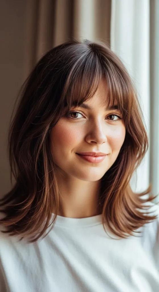 For a softer approach, this shaggy wolf cut with bangs features rounded fringe that gently follows the forehead curve. It creates a sweet and approachable look while still keeping the trendy layered structure.