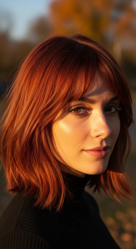 This wolf cut without bangs is trending across Pinterest for its cozy yet daring aesthetic. The warm tones complement many skin tones and glow beautifully in natural light. It’s perfect for anyone seeking a seasonal refresh that feels both trendy and effortlessly wearable.