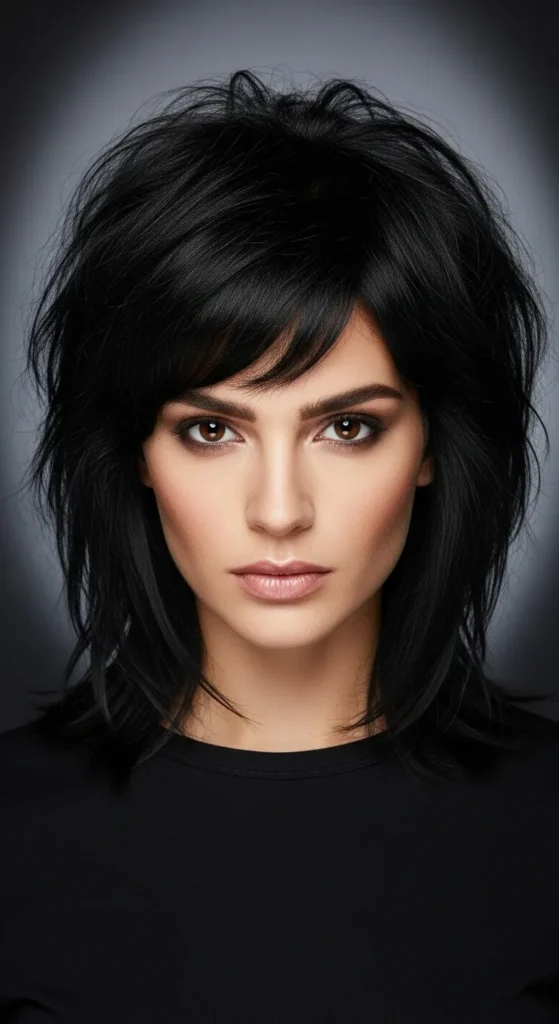 A jet black wolf cut without bangs makes a bold and powerful statement. The deep color sharpens the layered silhouette, giving the haircut dramatic contrast and edge. Without bangs, the strong lines of the cut remain visible, creating a clean and structured look that feels modern and confident.