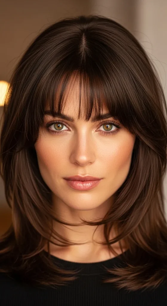 A brunette wolf cut without bangs with subtle highlights offers the perfect balance between natural and trendy. The soft caramel tones bring warmth and dimension, emphasizing the layered structure without overpowering the look. By leaving the forehead open, the haircut appears lighter and more refined.